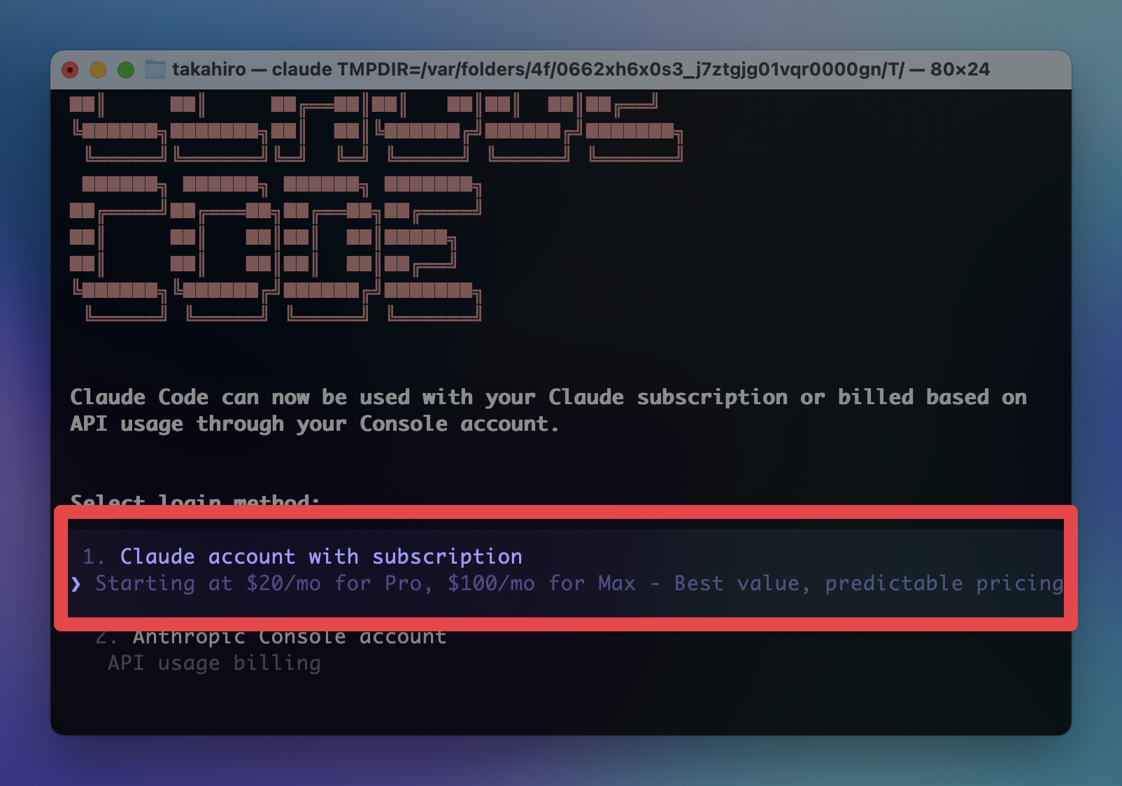 Claude.ai のサブスクプション(月額、年間などの有料プランを申し込んでいる方。Pro、MAX、Teamなど)は、以下のようにClaude Codeにログインしてください。