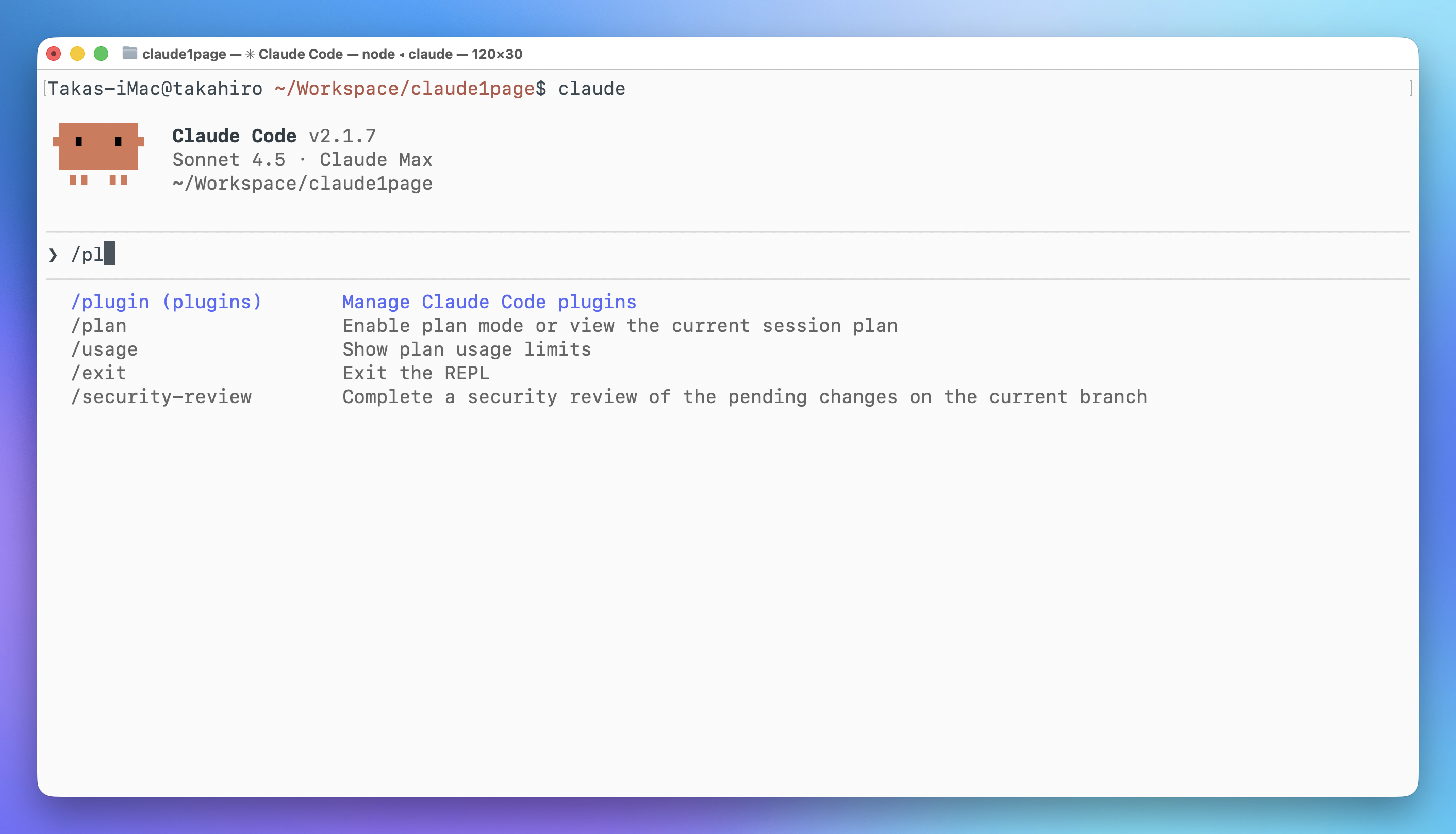 Claude Codeの起動後、以下のコマンドを実行してプラグイン管理画面を開きます。