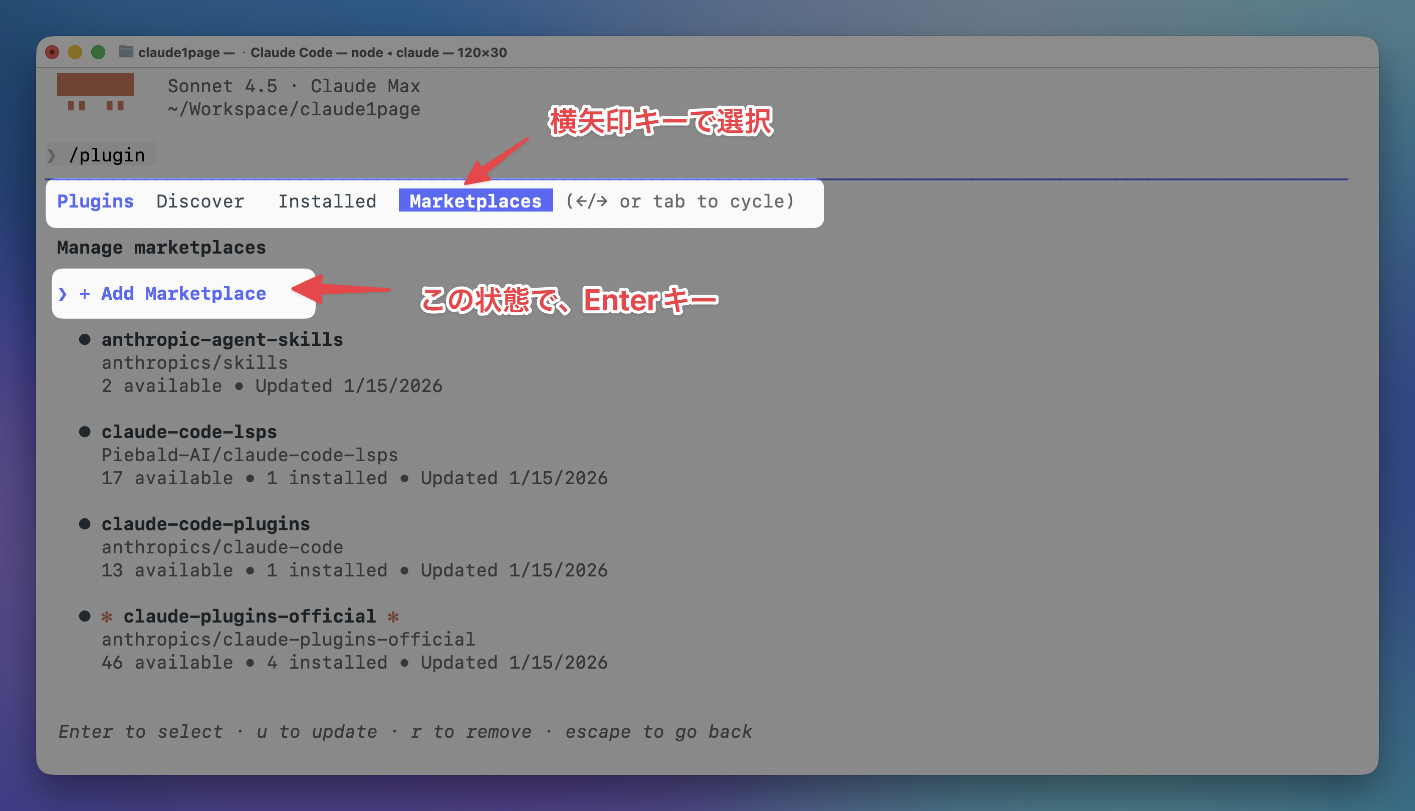 横矢印キー(→)で「Marketplaces」タブを選択し、「Add Marketplace」にカーソルを合わせてEnterキーを押してください。