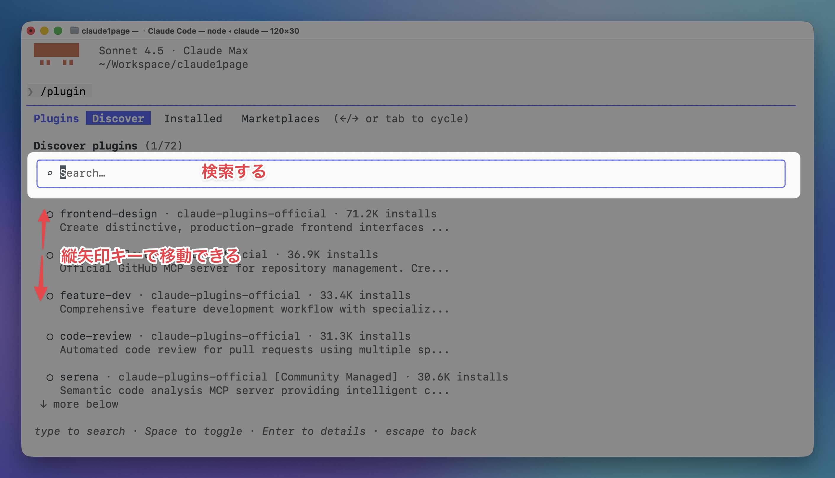 横矢印キー(→)で「Discover」タブに移動します。ここでインストール可能なプラグインを検索できます。