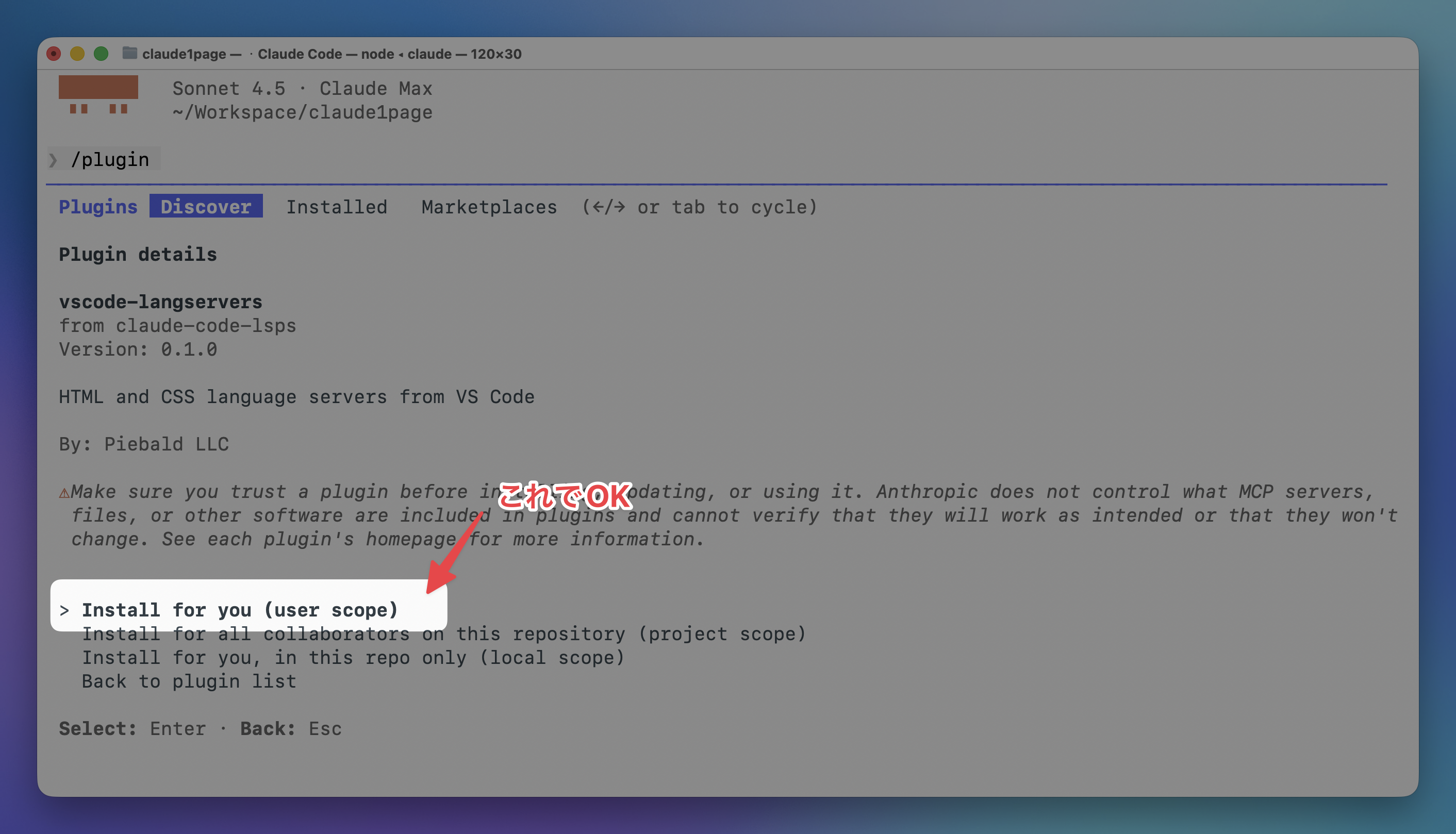 インストール範囲の選択画面が表示されたら、「Install for you (user scope)」を選択してください。これにより、あなた専用の環境にプラグインがインストールされます。