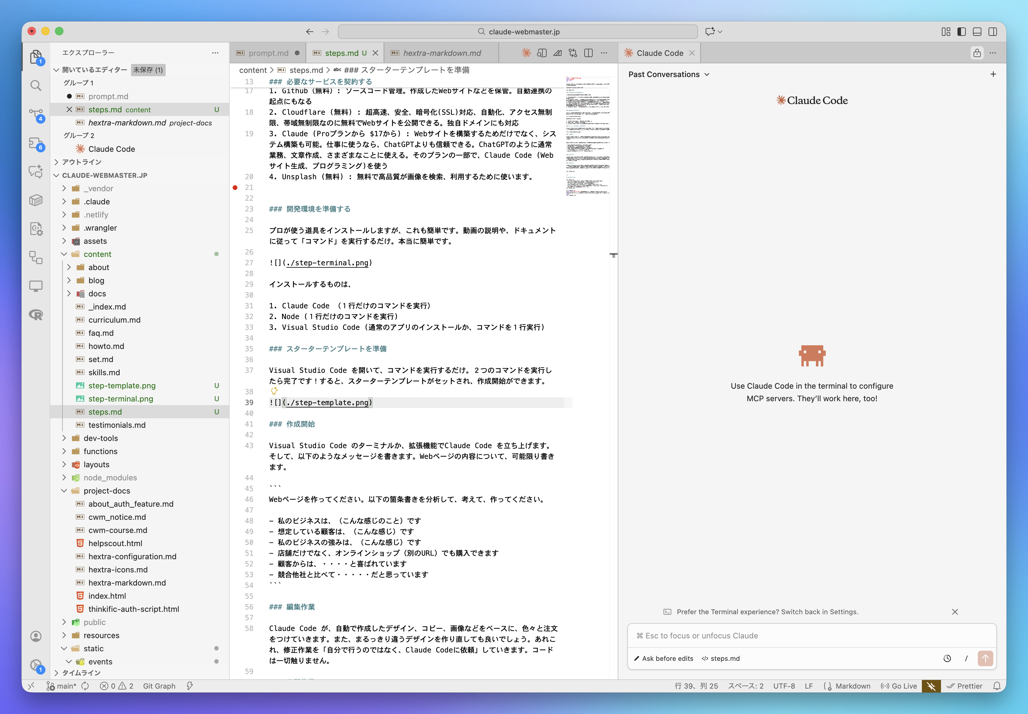 Visual Studio Code のターミナルか、拡張機能でClaude Code を立ち上げます。そして、以下のようなメッセージを書きます。Webページの内容について、可能限り書きます。
